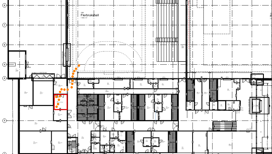 Man finner stoler, bord, skjøteledning, kofferter med paneler til å kontrollere tavlene i hallen og en Sandvika bag med anvisere/pil/etc, i lagerrommet markert i tegningen.