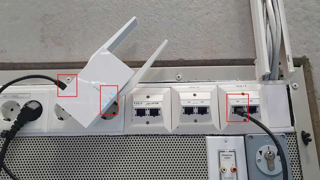 a) Plugg det trådløse aksesspunktet i kontakten på langveggen. Fold ut antenner og koble til nettverkskabel som vist på bildet under. Viktig at nettverkskabel kobles til i riktig port (port nr 44, port nr 2 fra høyre, se bildet). Etter at aksesspunktet er plugget i strømuttaket går det rundt regnet 2 minutter (øverste blå LED-lys blinker) før det er klart og leverer trådløst signal og internett tilgang. 3 LED-lys vil normalt lyse når aksesspunkt er klart (se bildet).